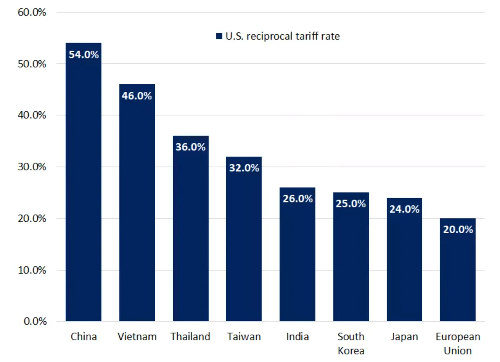 美国对其传统意义上的贸易合作伙伴,如五眼联盟(英国、澳大利亚、新西兰)等设立 10% 左右的最低基准关税。值得注意的是,上述这些国家对美的关税税率也差不多为 10% 左右。这部分关税总体上符合市场预期。