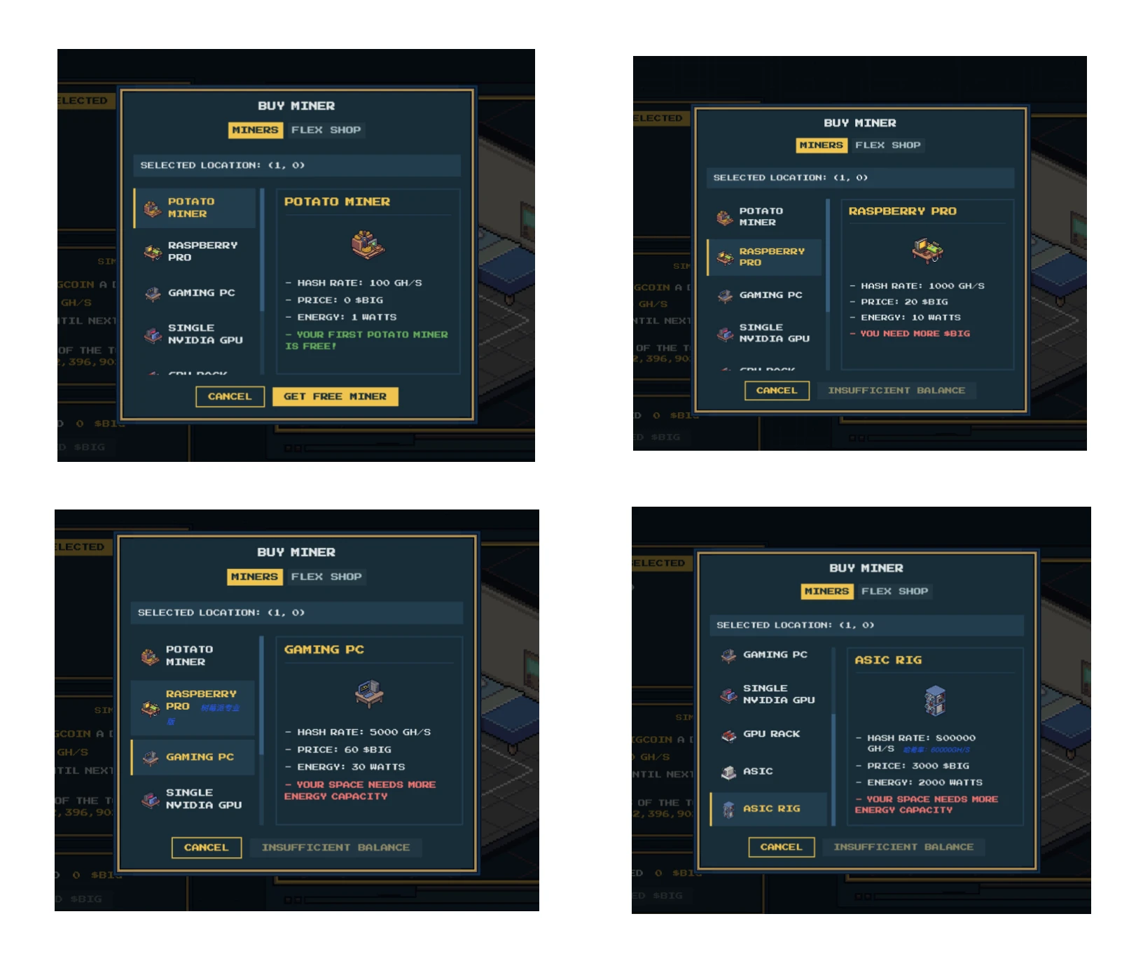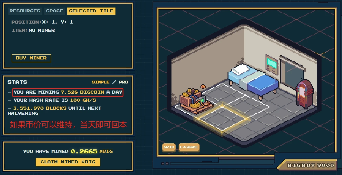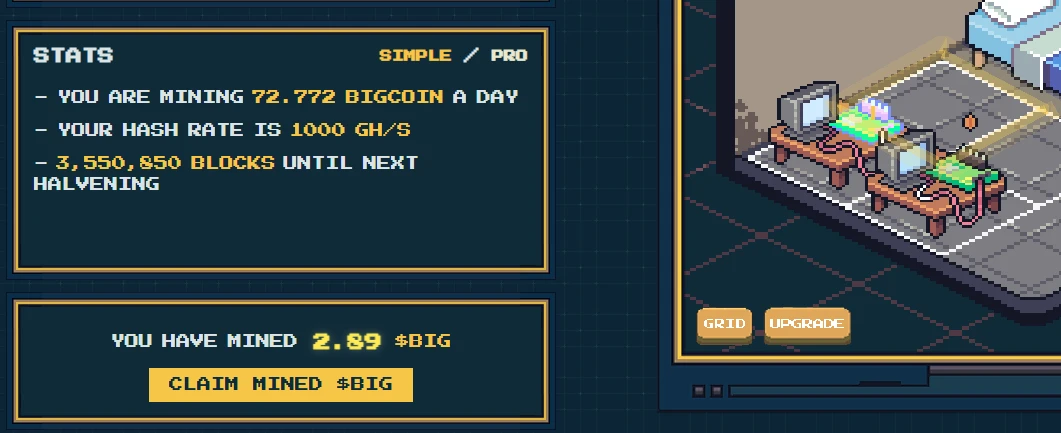 链上挖矿 :无需昂贵的物理硬件,玩家通过购买虚拟“矿机”和“设施”参与挖矿,降低准入门槛,任何人都可以通过链上交互赚取 BIG。