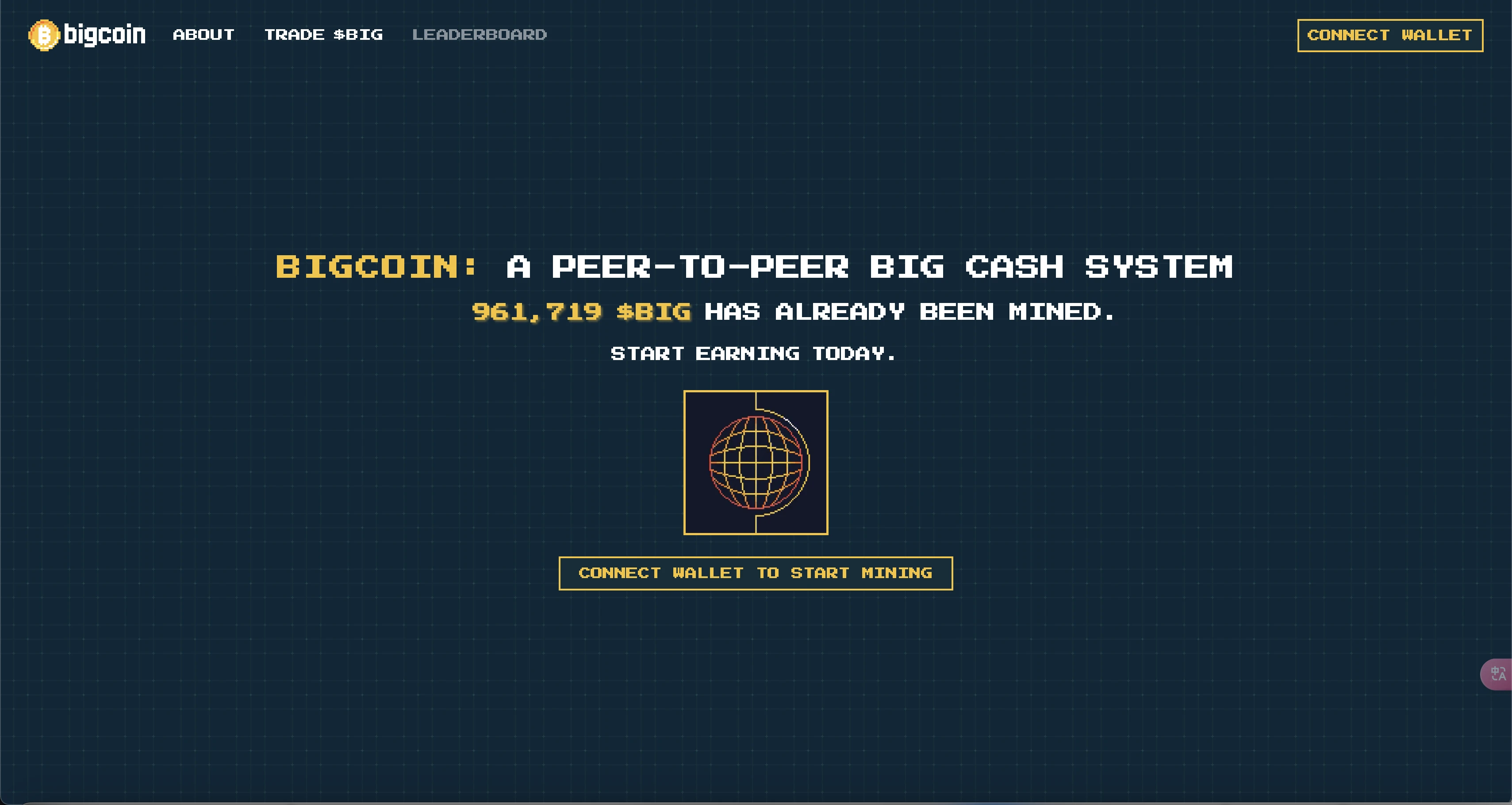 Bigcoin 是一个基于 Abstract 链的区块链挖矿游戏项目,据 白皮书 ,其灵感来源于比特币的标志性机制。Bigcoin 将比特币的固定供应量、减半机制和去中心化挖矿模型与链上游戏化设计相结合,旨在为新一代用户(玩家、创作者、投资者)提供一个易于参与、社区驱动且充满潜力的交互项目; 通过可访问的链上挖矿和病毒式激励机制,重现比特币的成功,同时解决比特币高成本、缓慢交易和硬件壁垒等问题 。