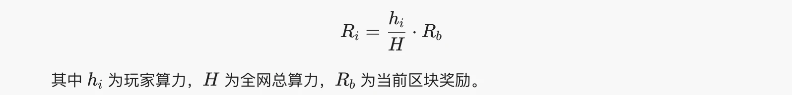 奖励分配 :每个区块的 BIG 奖励根据玩家算力占全网算力的比例分配,公式为:
