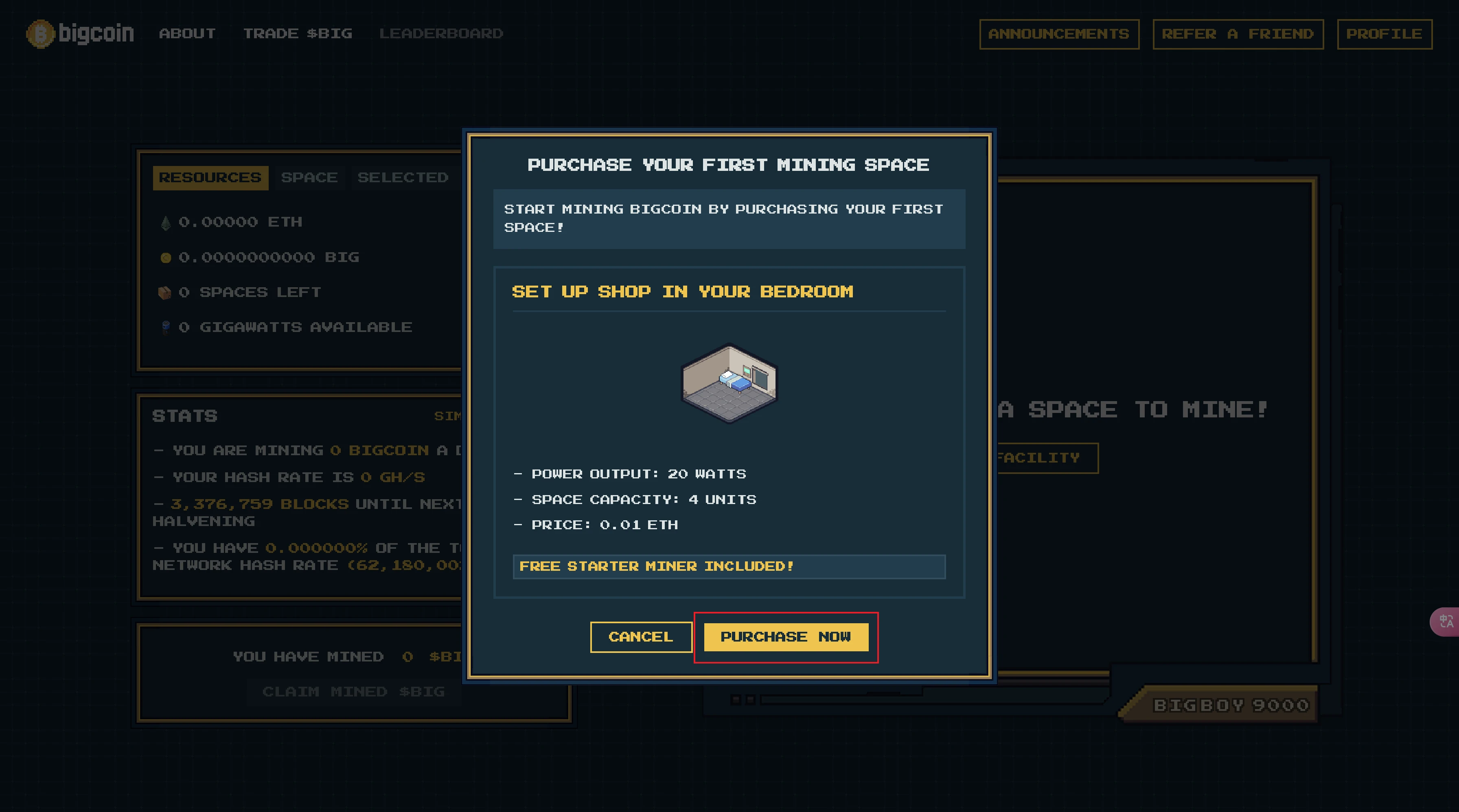 低成本进入 :玩家仅需少量 ETH 购买初始设施(附赠可选免费矿机),后续所有升级均使用 BIG 代币,降低新手参与门槛。