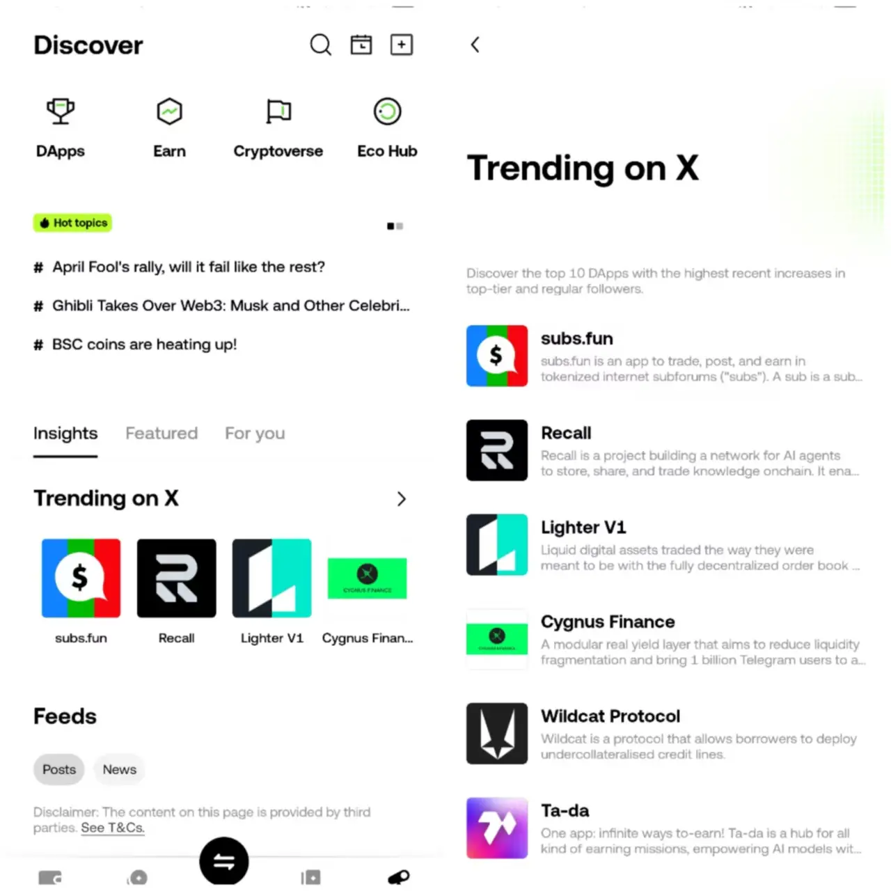 #案例4:OKX Wallet 在 Discover 页面,集成 X 热门项目数据,帮助用户发掘热门项目。