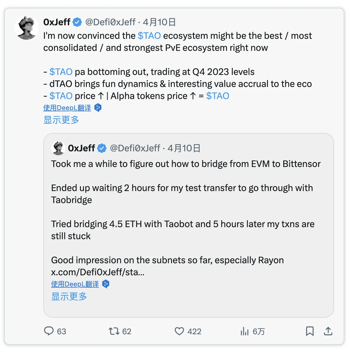 尽管我曾经公开表达过对桥接和交易体验的失望,但 Bittensor 的技术、产品和氛围非常出色,尤其是 @rayon_labs 的团队。