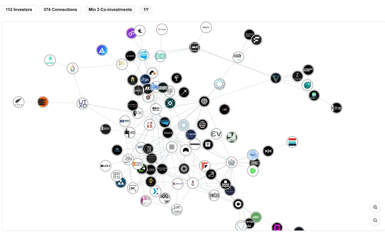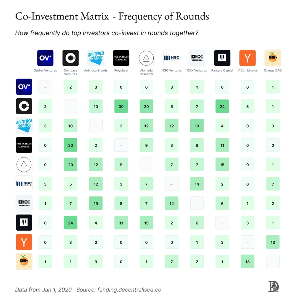 研究数据的另一种方式是分析最活跃投资基金的行为。上面的矩阵分析了自 2020 年以来投资数量最多的基金,以及它们之间的关系。你会注意到,加速器(如 Y Combinator 或 Outlier Venture)与交易所(如 Coinbase Ventures)几乎没有联合投资过。