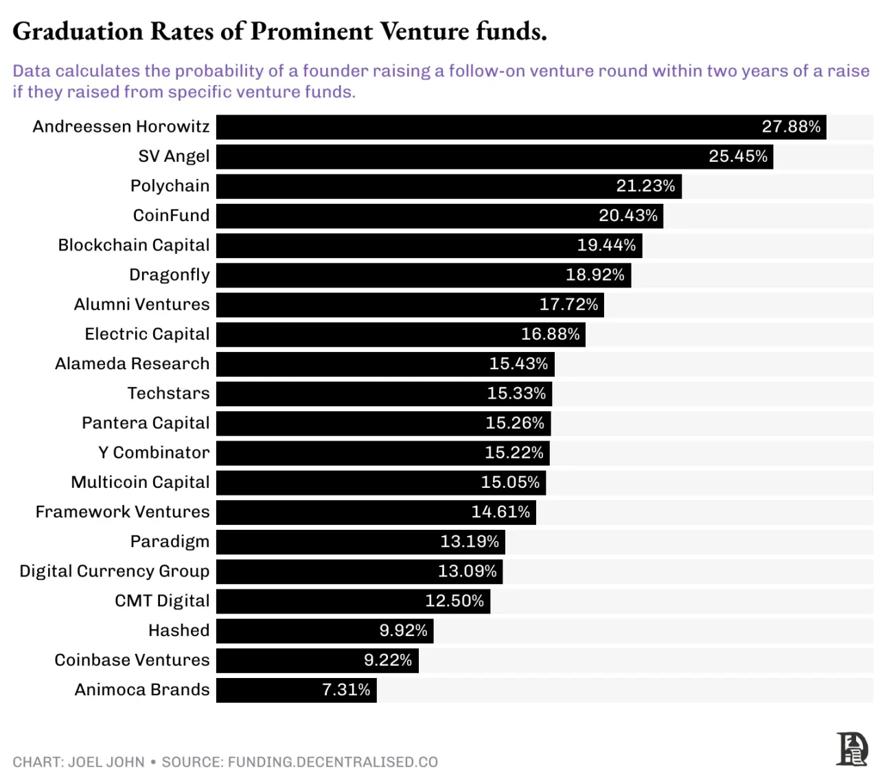 即使在排名前 20 的基金中,幂律法则也表现得极为极端。例如,从 A16z 获得融资意味着你有 1/3 的机会在两年内再次融资。也就是说,A16z 支持的每三家初创公司中,就有一家能获得 A 轮融资。考虑到另一端的概率仅为 1/16 ,这算是相当高的毕业率了。
