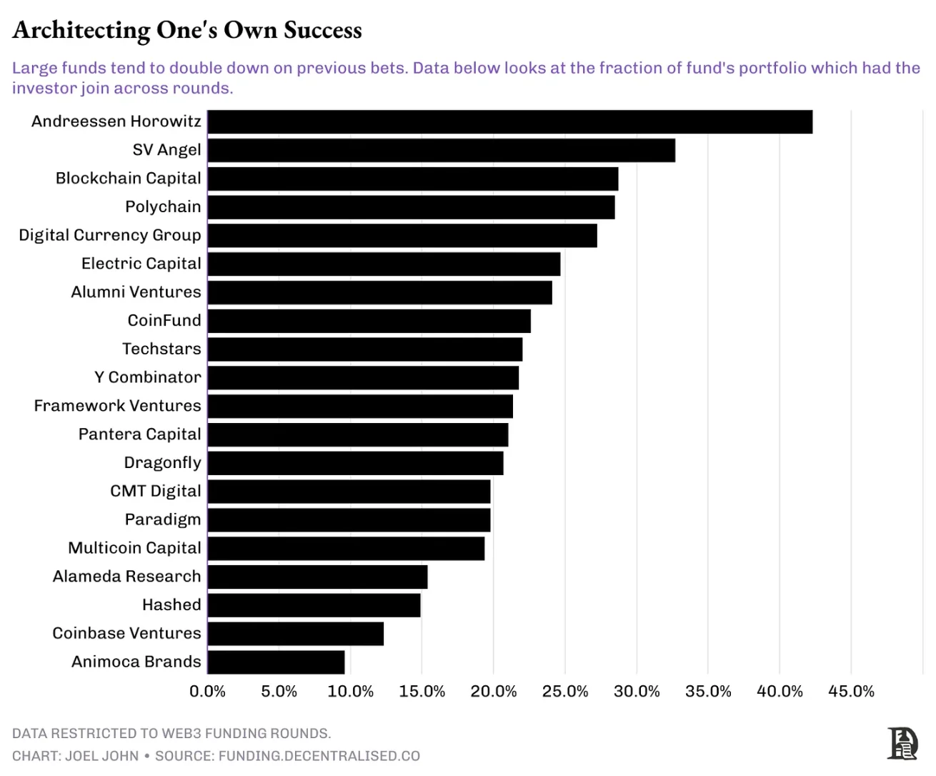 很快就能看出一个明显的模式。管理资金超 10 亿美元的大基金更倾向于频繁参与后续融资。例如,在 A16z 投资组合中,有 44% 的公司获得 A16z 的后续投资。Blockchain Capital、DCG 和 Polychain 对其投资中四分之一的再融资项目进行了跟投。