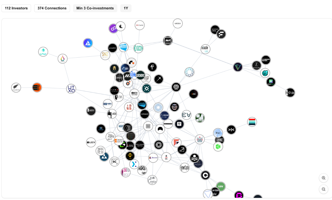 研究这些数据的另一种方法是分析最活跃投资者的行为。上面的矩阵考虑了自 2020 年以来投资数量最多的基金,以及它们之间的关系。你会注意到,加速器(如 Y Combinator 或 Outlier Venture)很少与交易所(如 Coinbase Ventures)进行联合投资。