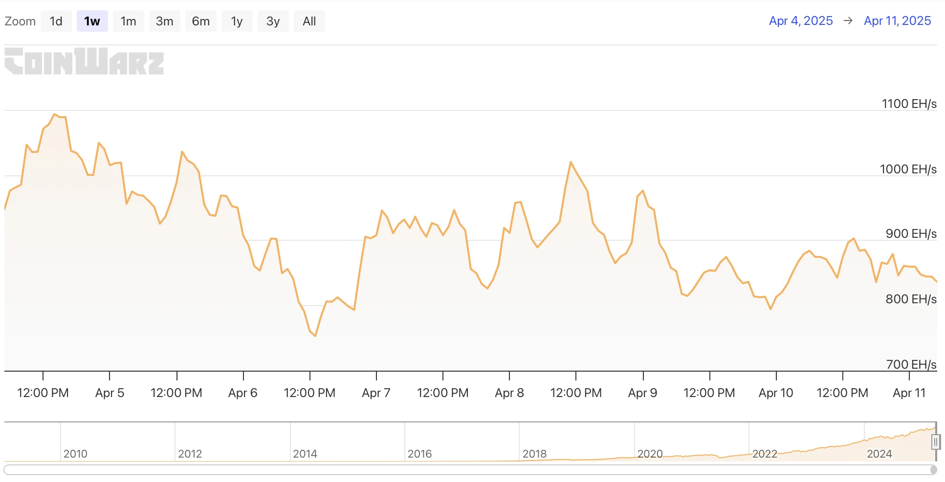 在 2025 年 4 月 5 日至 4 月 11 日期间,比特币网络哈希率呈现波动,具体情况如下: