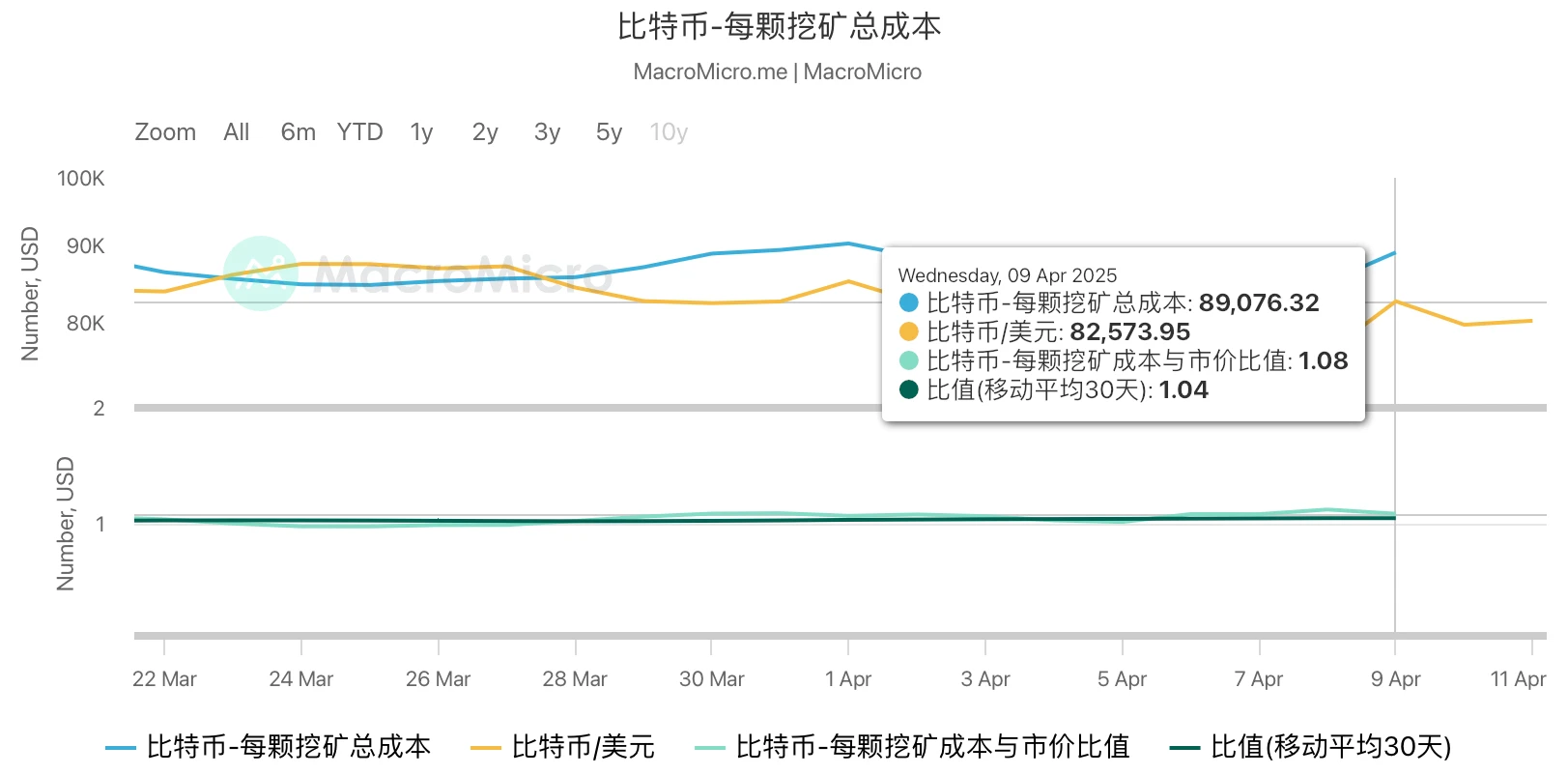 根据 MacroMicro 最新模型估算,截至 2025 年 4 月 9 日,比特币单位生产成本约为 89, 076.32 美元,而当日现货价格约为 82, 573.95 美元,对应的 挖矿成本与市价比值(Mining Cost-to-Price Ratio) 为 1.08 。该比值显著高于 1 ,表明当前市场价格已低于全网平均挖矿成本,网络整体处于盈亏平衡点以下运行,多数矿工处于利润压缩或亏损状态。
