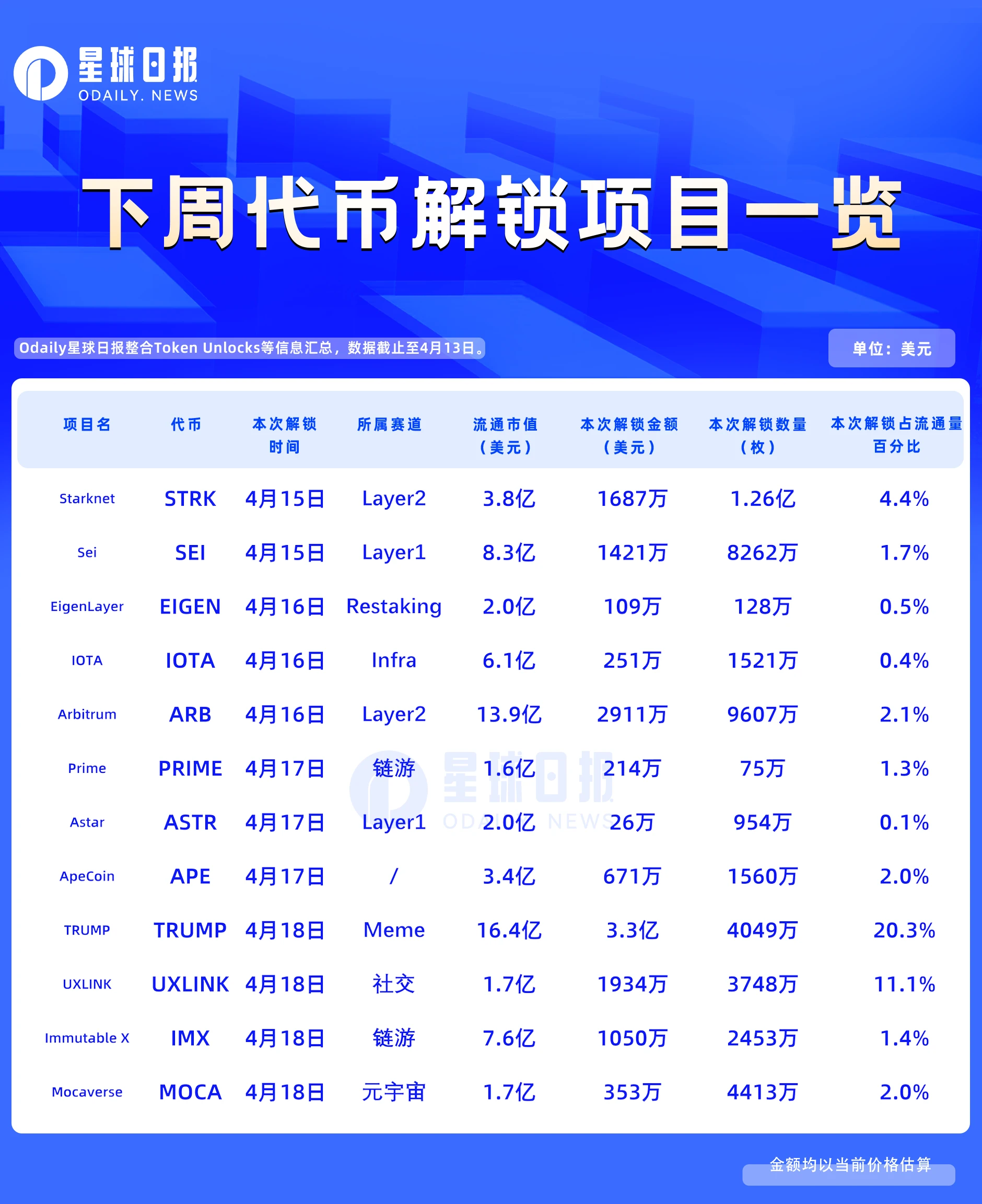 本周共 12 个项目解锁,其中 TRUMP 与 UXLINK 迎来大额解锁,STRK 解锁比例相对较高。