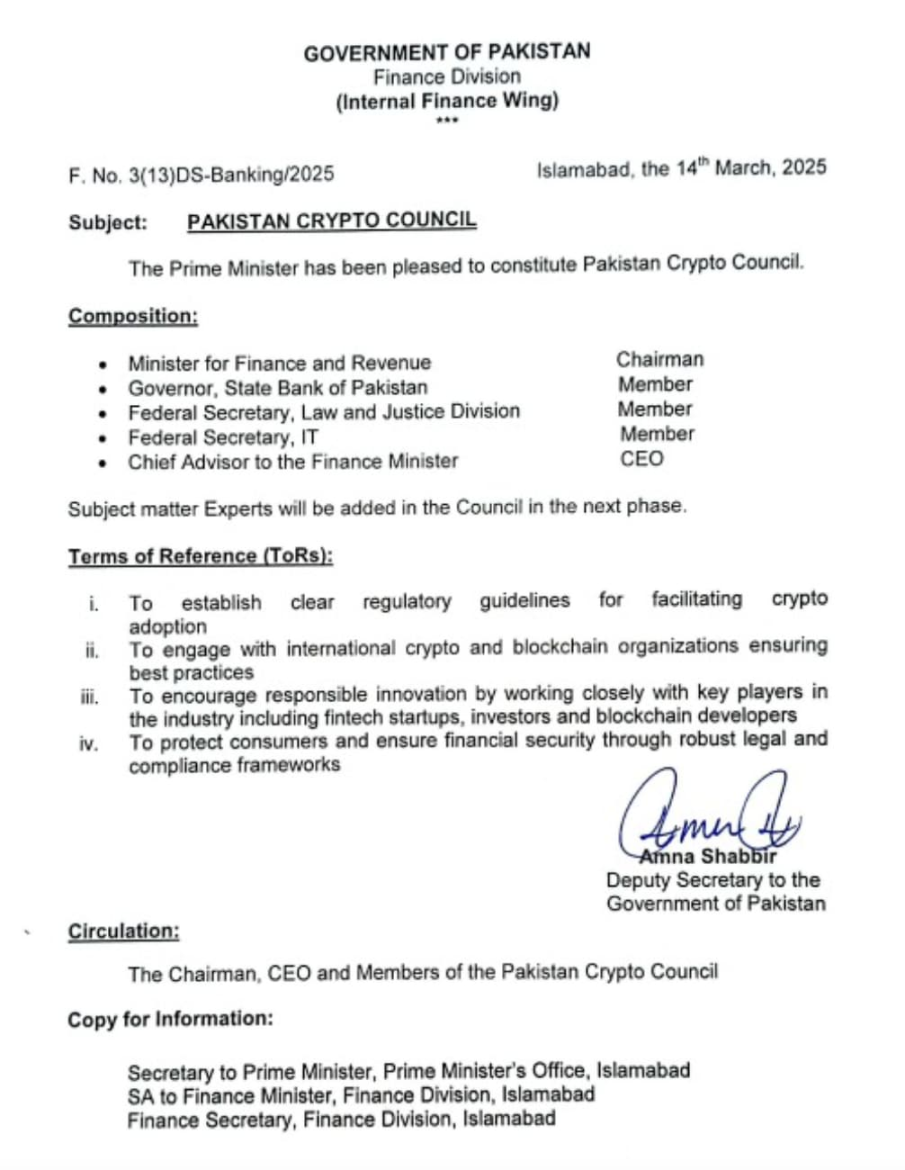巴基斯坦加密货币委员会(PCC)于 2025 年 2 月由财政部提议设立,隶属于财政部,于 3 月正式宣布成立,主要职责是监督区块链技术和数字资产在该国金融领域的整合和采用。