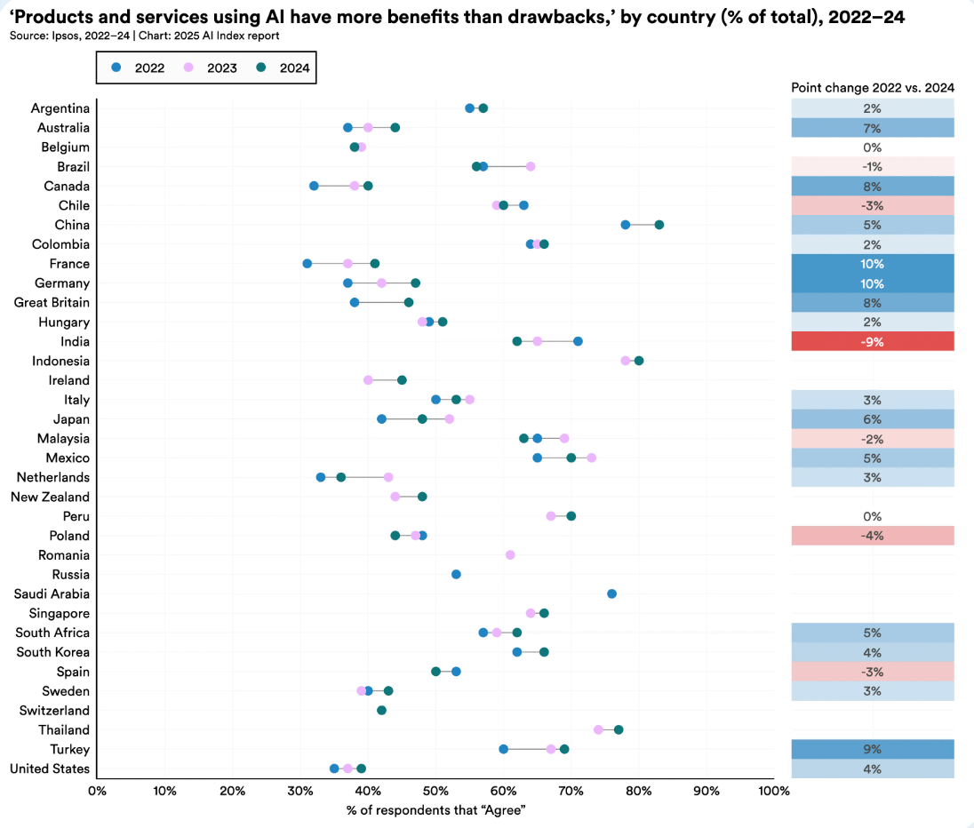 在中国(83%)、印度尼西亚(80%)和泰国(77%)等国家,大多数人认为人工智能产品和服务利大于弊。相比之下,在加拿大(40%)、美国(39%)和荷兰(36%)等地,乐观情绪仍远低于此。