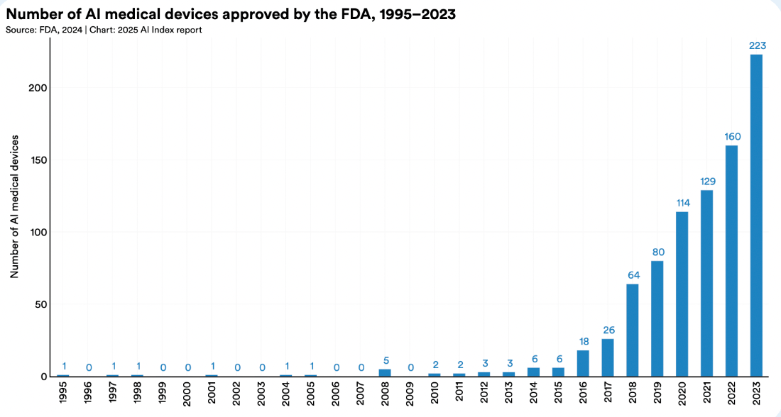 2023 年,美国食品药品监督管理局(FDA)批准了 223 款人工智能辅助医疗设备,而 2015 年这一数字仅为 6 款。在道路上,自动驾驶汽车已不再是实验品:美国最大的运营商之一 Waymo 每周提供超过 15 万次自动驾驶服务,而百度的 Apollo Go 无人驾驶出租车车队如今已在中国多个城市投入运营。