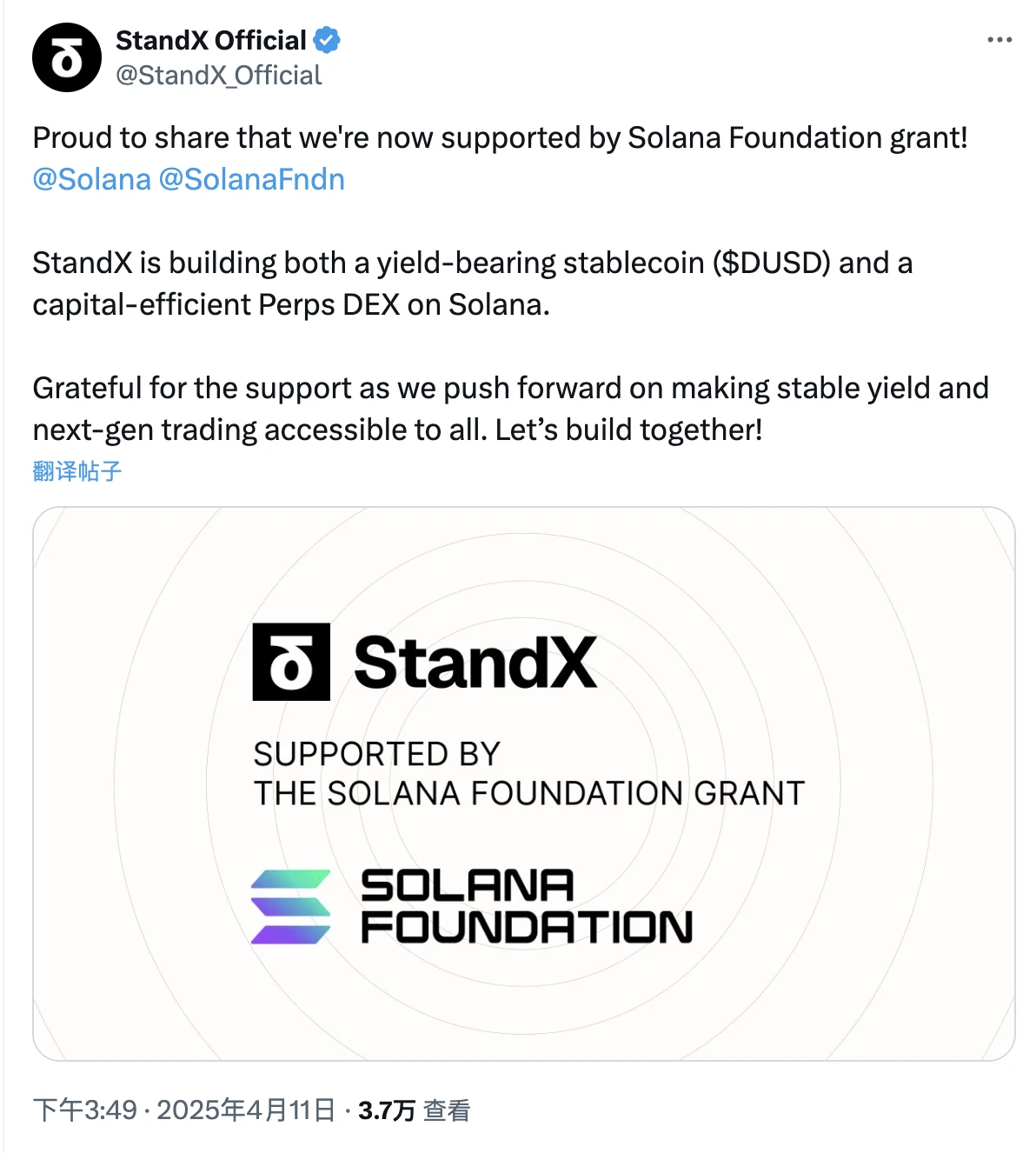 StandX 的联合创始人曾为币安合约团队的创始成员,该项目 近期在中文社区热度较高,但因暂时没有融资背书,部分用户对此也存在一定顾虑。4 月 11 日,StandX 宣布已拿到 Solana 基金会的资助,算是在一定程度上部分打消了市场顾虑。