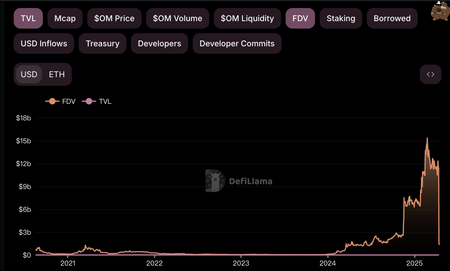 2022年,MANTRA DAO宣布正式更名为MANTRA,启动品牌重组,表示其试图从去中心化自治组织(DAO)转型为更广义的区块链生态。自2024年以来,MANTRA又因OM强势拉盘备受关注。CoinGecko数据显示,仅在2024年,OM最高上涨超168.8倍。同时,DeFiLlama数据显示,OM的完全稀释估值(FDV)在今年3月一度达到153.9亿美元,目前大幅回落已12.5亿美元。然而,与其高估值形成鲜明反差的是,自2023年以来,OM的总锁仓价值(TVL)长期处于低位,仅维持在数十万美元水平。