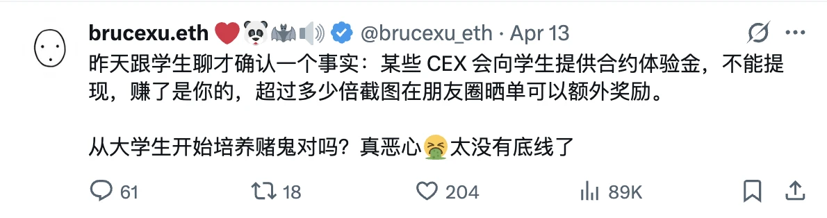 4 月 13 日,以太坊中文社区 ETHPanda、LXDAO 联合发起人 Bruce Xu 于 X 平台 发文曝光 ,称:“昨天跟学生聊才确认一个事实:某些 CEX 会向学生提供合约体验金,不能提现,赚了是你的,超过多少倍截图在朋友圈晒单可以额外奖励。 从大学生开始培养赌鬼对吗?真恶心。? 太没有底线了。”