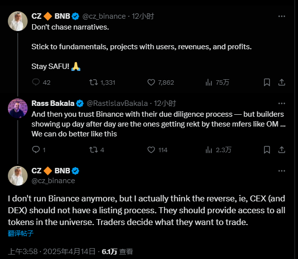 锅既然来了,CZ也出面回应,向投资者建议“不要追逐叙事。坚持基本原则、有用户、有收入、有利润的项目”。随后CZ也表示,“中心化交易所(CEX)和去中心化交易所(DEX)不应该有上市流程。它们应该提供对全球所有代币的访问。交易者自行决定他们想要交易什么。”