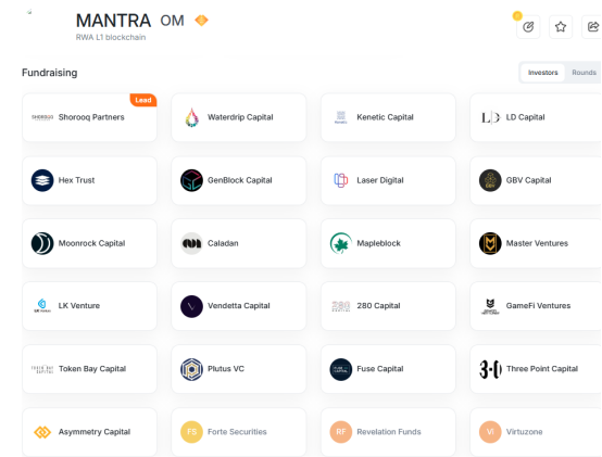要聊OM,先简单介绍下MANTRA。OM是MANTRA发行的原生代币,该项目的前身为MANTRA DAO,于2020年成立,在成立之初基于波卡建立,专注于质押和借贷,简而言之就是Defi,后摇身一变成为了以RWA为核心的L1区块链。从Rootdata的数据来看,该项目也拥有一众豪华投资方,包括水滴资本、了得资本,就在去年3月份,其还完成了由Shorooq Partners领投的1100万美元融资。RWA业务进展也颇为良好,MANTRA在今年1月与阿联酋地产开发商 Damac Group 签订协议,计划在今年将价值至少10亿美元的 DAMAC 集团的资产代币化。先不论项目发展如何,至少运营始终持续,对一个代币而言,能存在5年已然是有些来头,OM还接连上过OKX与币安,也能间接说明其背后团队实力不俗。