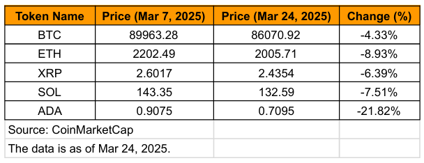 下表统计了几种主要加密货币,自峰会结束后(3月7日)至3月下旬(3月24日)期间的价格走势: