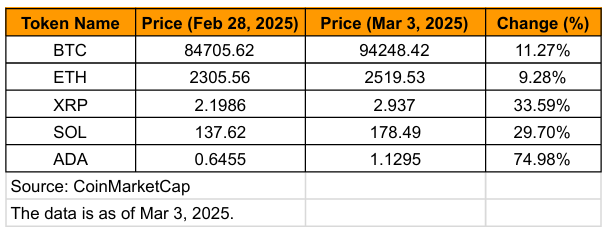 受此影响, 市场对于“特朗普政府或将宣布重大利好”的预期迅速升温 。比特币从8.4万美元上涨至接近9.5万美元,特朗普所提到的几种币种(BTC、ETH、XRP、SOL、ADA)也在2月底至3月初期间出现明显涨幅。下表统计了这些主流加密资产自2月28日至峰会开始前(3月3日)期间的价格走势:
