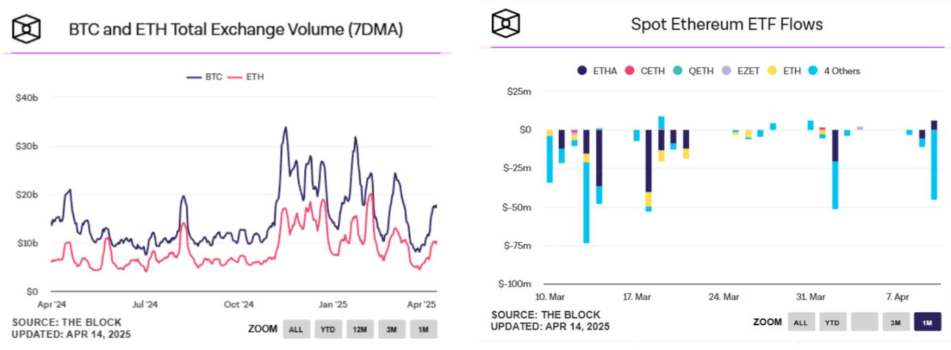 从交易所数据上,可以看出在交易量上比特币的峰值明显较大,并且波动更强,说明市场资金更多涌入比特币现货及衍生品交易。而在 ETF 数据上,以太坊现货 ETF 在近一月内录得多日流出,单日最高流出达 7500 万美元。从市场表现差异可进一步看出,当前加密资产的风险偏好呈现显著分化特征,以太坊现货 ETF 的资金撤离则暴露出市场对加密生态节奏放缓的担忧,特别是在 Layer 2 竞争加剧、新公链分流开发者资源的背景下,部分机构投资者选择转向。