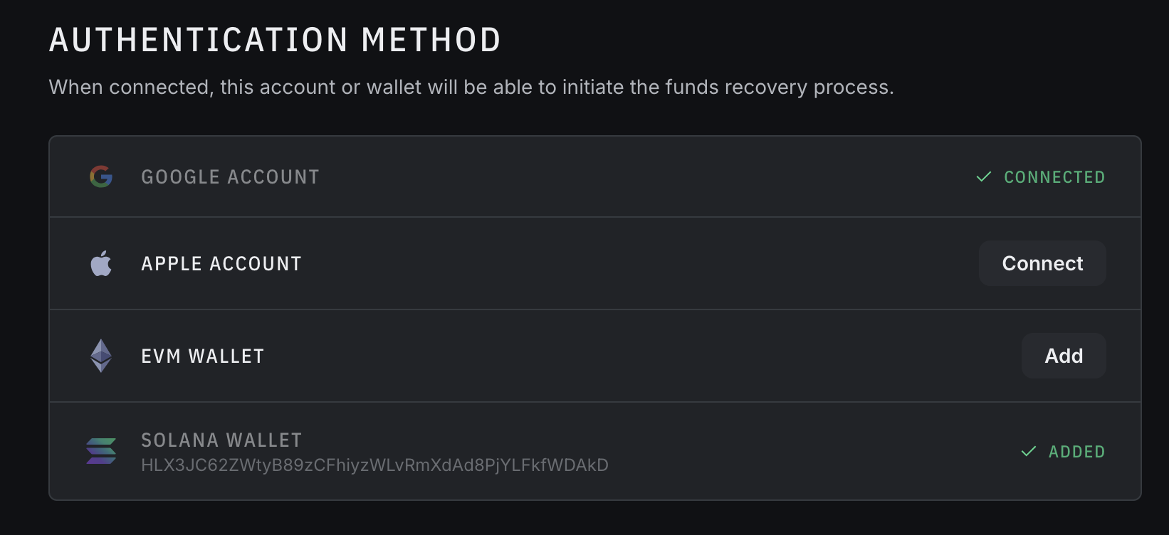 这是一个保险库功能,当用户无法使用Infinex账户取回资产时,可以使用备用的保险库地址来取回资金。首先,用谷歌账户或者苹果账户作为用户链外身份验证,验证通过后,就可以恢复账户,资金就会退回到用户提前备份的保险库地址,目前支持EVM和Solana地址。