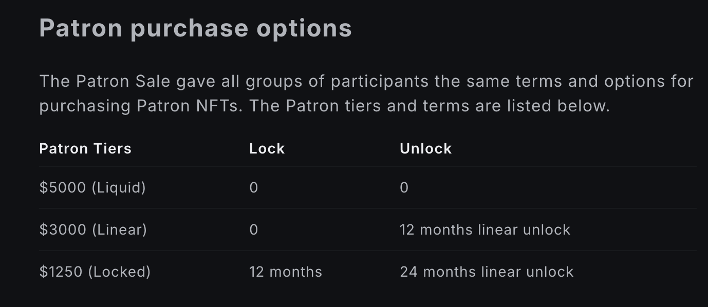 3000美金/张的Patron是从TGE开始,分12个月线性释放;
