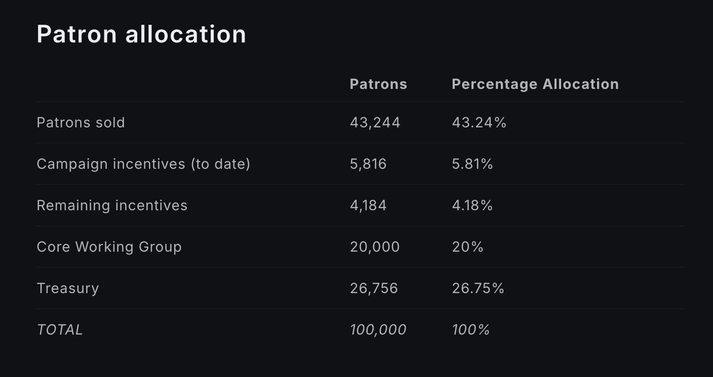 最终,Patron NFT总共销售了43244个,累计收到6769万美金(Kain的吸金能力是真特么强)。