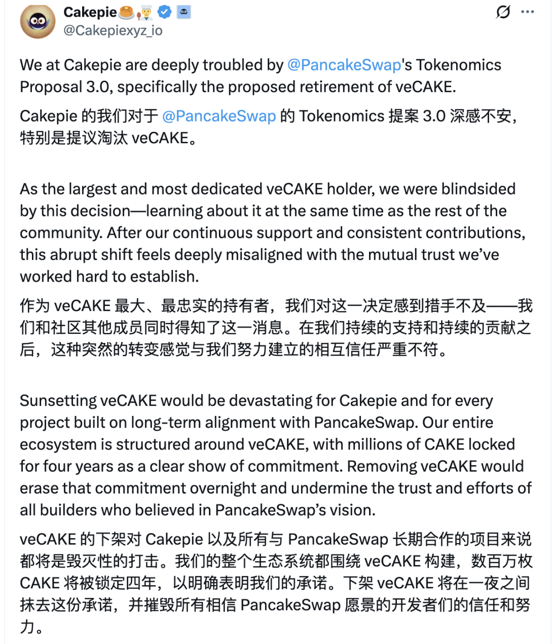 在此次提案引发的热议中,不同群体的声音各异。Cakepie DAO 在社交媒体上发起了强烈抗议,指责这一改革「背弃了长期激励和生态共建的初衷」,并提出了包括部分调整而非全盘取消 veCAKE 的替代方案。该 DAO 认为,长期锁仓所形成的治理权和分红机制正是推动 PancakeSwap 持续发展的关键所在,一旦取消,其损失不仅体现在经济收益上,更会对整个生态系统的信任基础造成致命打击。