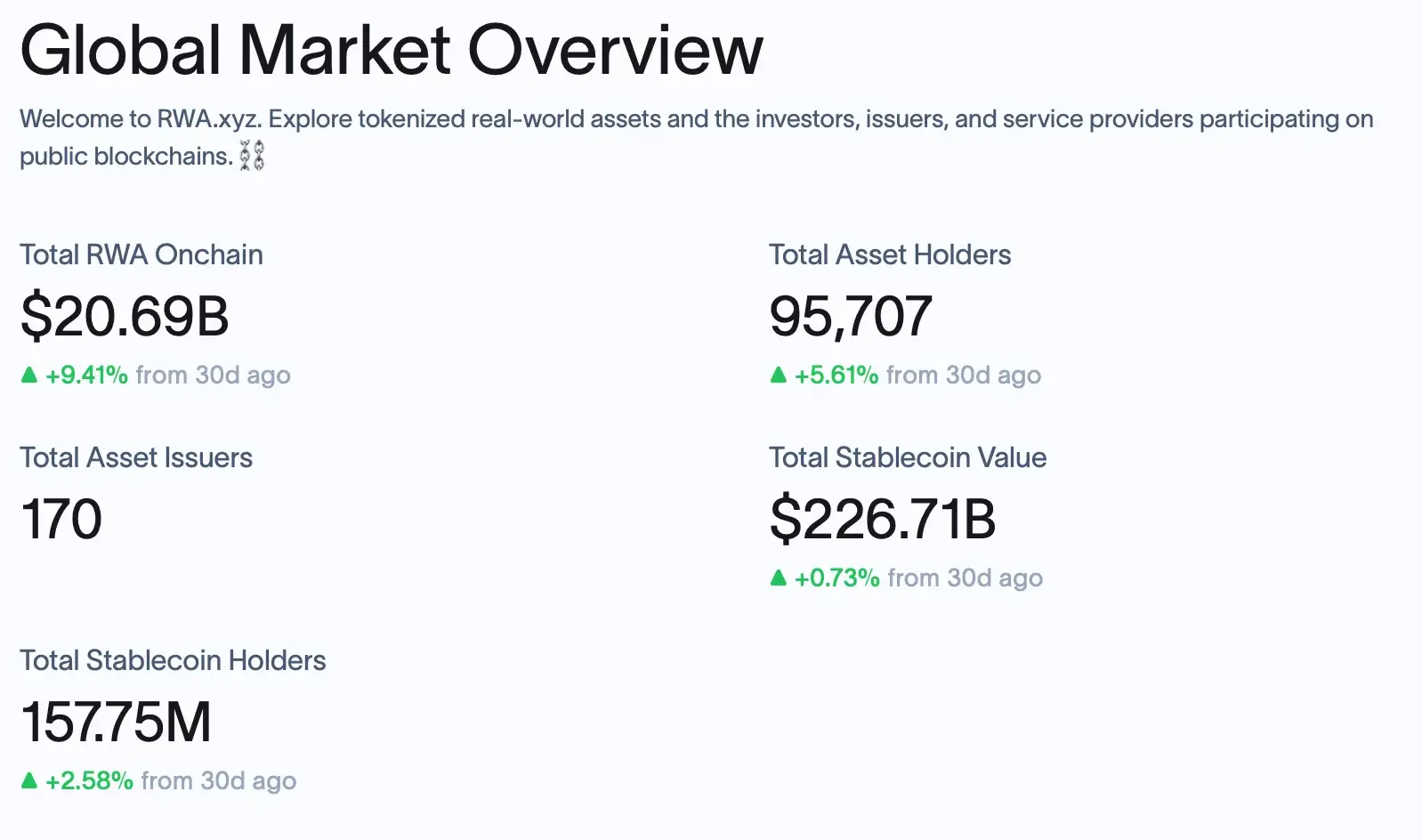 据rwa.xyz(RWA的专业分析网站)数据,如今链上RWA资产的总值为206.9亿美元(不包含稳定币),其主要构成为私人信贷、美债、大宗商品、房地产、股票证券。
