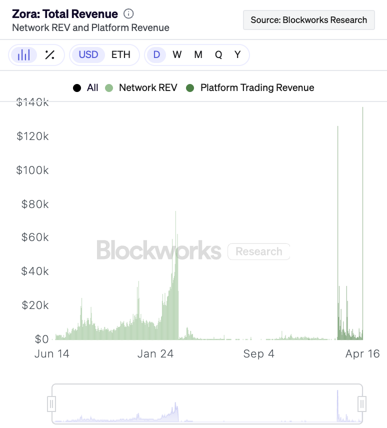根据Blockworks数据显示,Zora最新日收入超过13.7万美元,创下近两年来少有的高点。而在此之前,受NFT市场低迷影响,Zora一度陷入参与度大幅下滑的困境。但相比此前NFT热潮的收入,现阶段Zora已下滑不少。