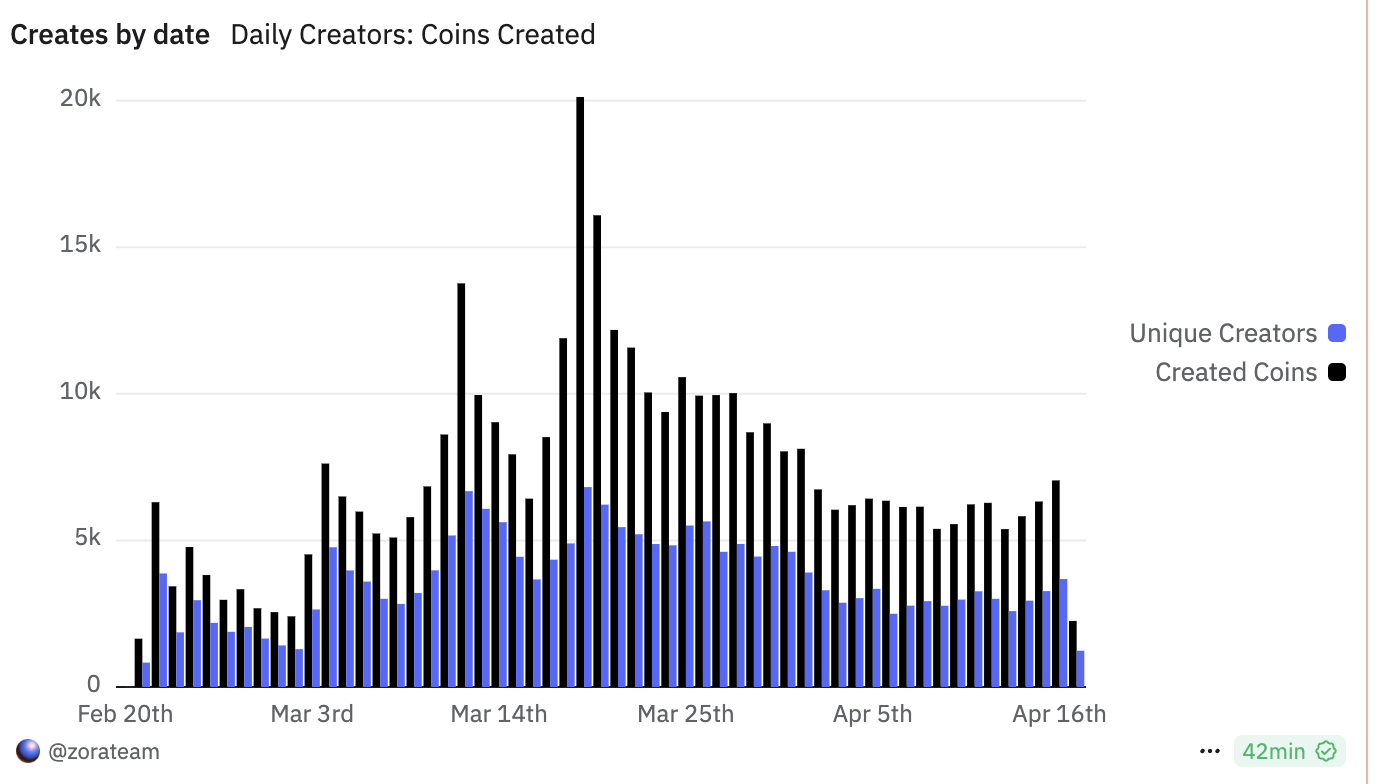 不仅如此,Zora的市场参与度仍有限。Dune数据显示,过去两个月,Zora每日独立创作者数量维持在数千万人,每日代币创建数量维在在数千至数万枚之间。与Pump.fun等其他MEME币发行平台相比,Zora的市场份额仍有差距:截至4月16日,对比Pump.fun与Zora的市场占有率,分别为74.3%和25.7%。而在Base生态内部,Zora的发币数量仅占4%,影响力非常有限。