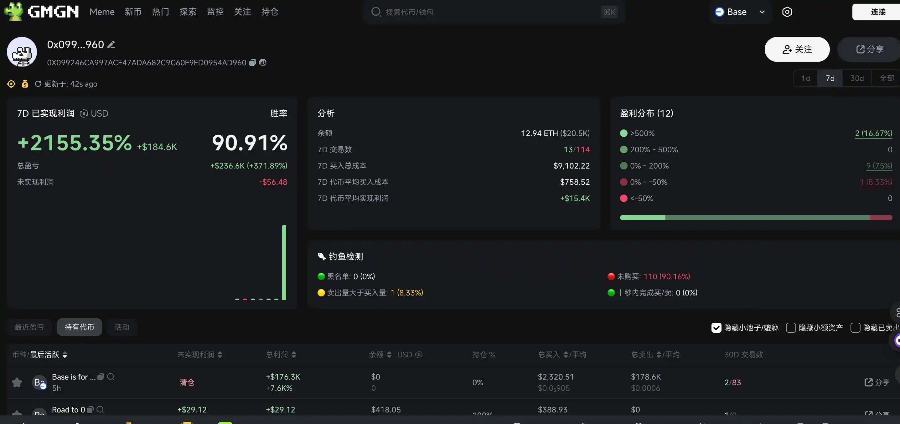 同时,我们也用 GMGN 看了看这个地址的概况,除了 Base is for everyone 大获全胜外,该地址也是其他 Base 上 Meme 币的狙击常客,同时被平台标记为聪明钱。