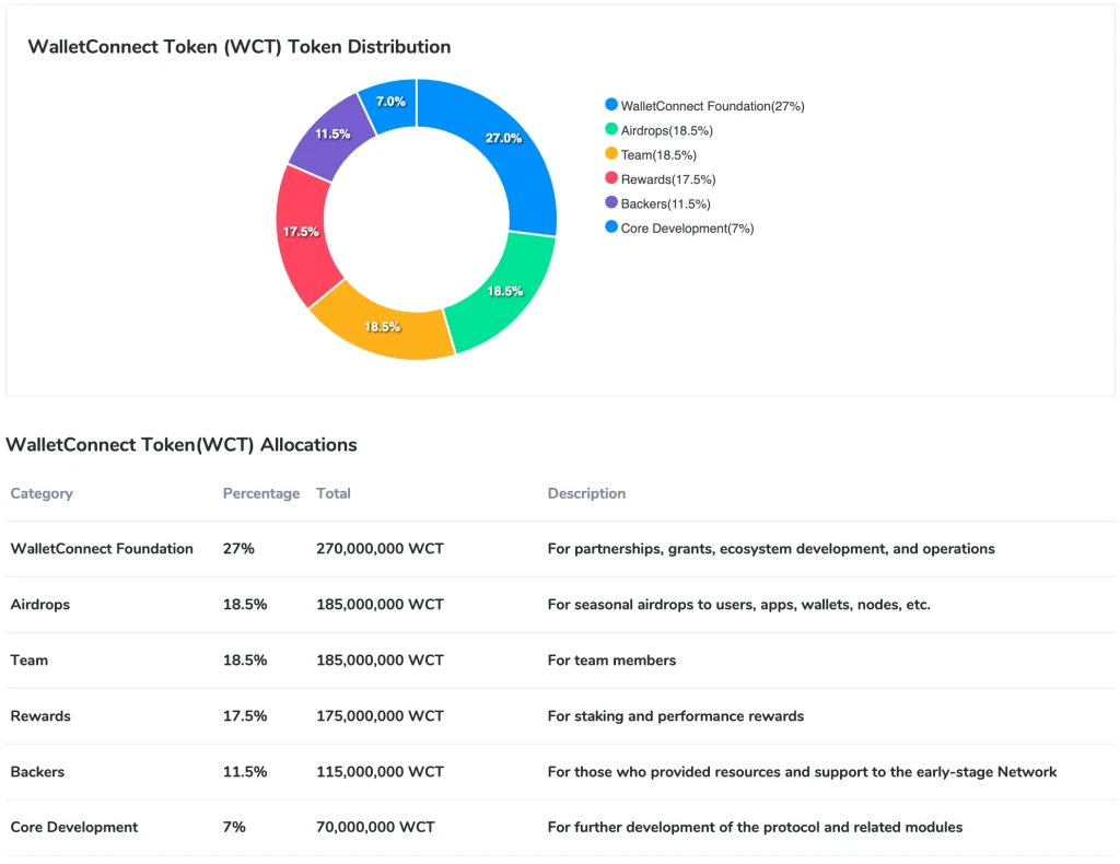 分配方案:部分代币分配给 WalletConnect 基金会、早期投资者、核心开发者、生态激励基金和用户空投等渠道。