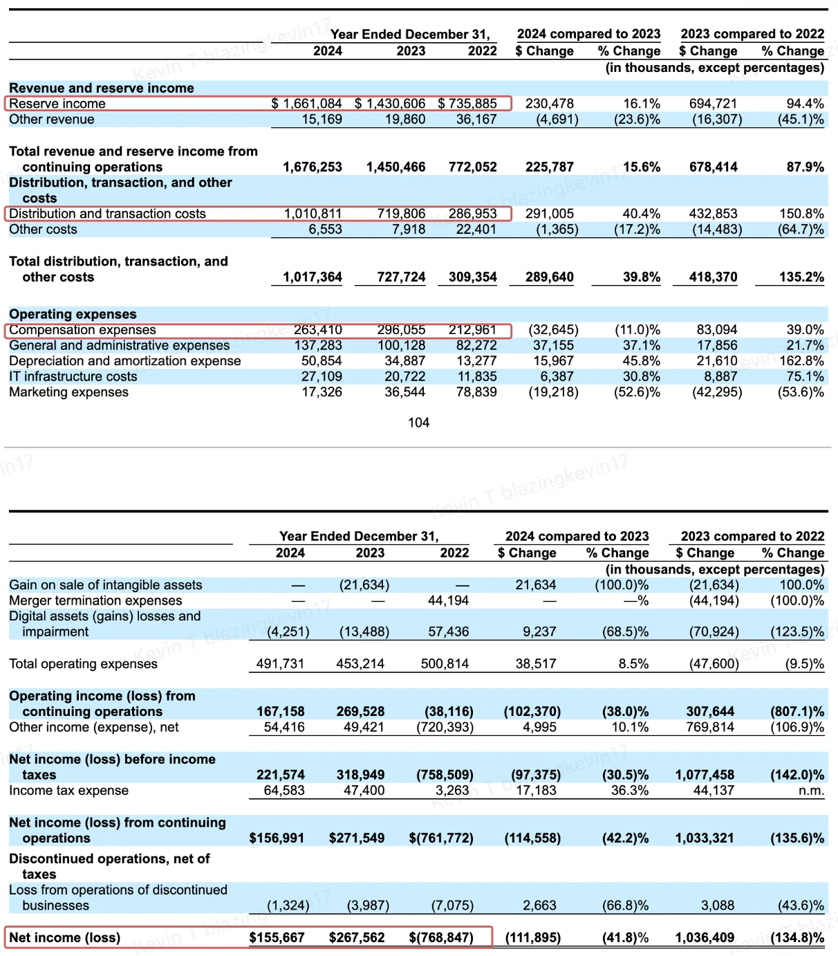 分销支出激增压缩毛利空间:Circle 的分销与交易成本在三年内大幅上升,从 2022 年的 2.87 亿美元跃升至 2024 年的 10.1 亿美元,涨幅高达 253% 。这类成本主要用于 USDC 的发行、赎回及支付清结算系统支出,随着 USDC 流通量扩大,该项支出随之刚性增长。