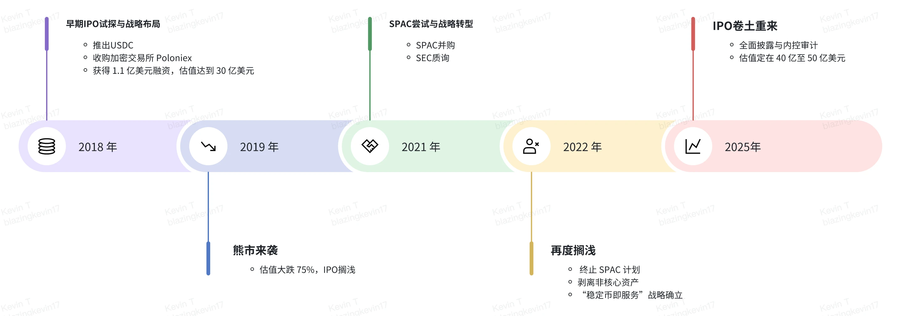 Circle 的上市征程堪称加密企业与监管框架动态博弈的活标本。2018 年的首次 IPO 试探,正值美国证监会(SEC)对加密货币属性认定模糊期。彼时公司通过收购 Poloniex 交易所形成"支付+交易"双轮驱动, 并且获得了比特大陆、IDG 资本、Breyer Capital 等机构的 1.1 亿美元融资,但监管机构对交易所业务合规性的质疑以及突如其来的熊市冲击导致估值从 30 亿美元暴跌 75% 至 7.5 亿美元,暴露出早期加密企业商业模式的脆弱性。