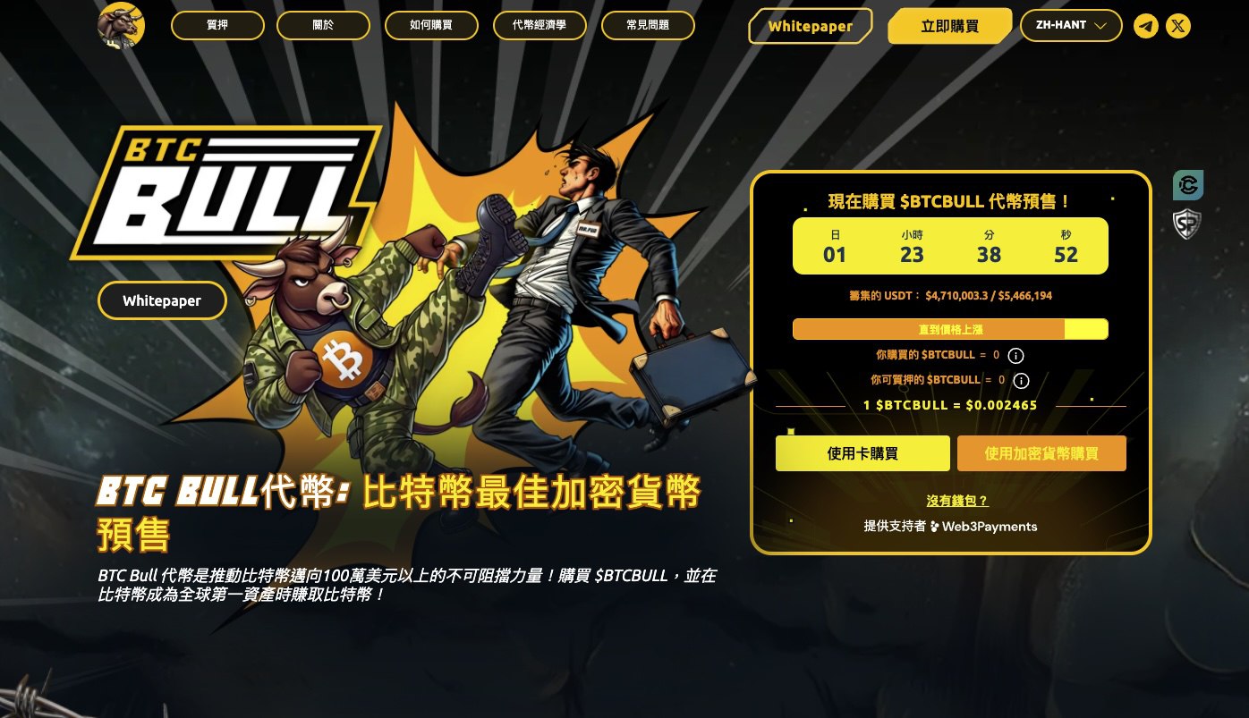 目前 $BTCBULL 正在进行预售,单价仅为 $0.002465,预计将募集总额达 450 万美元。投资者除了持币升值外,还可参与质押,年化报酬高达 150%,并有机会获得 BTC 空投。