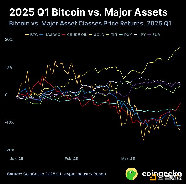 3. 比特币在 2025 年第一季度下跌 -11.8%,表现逊于黄金和美国国债