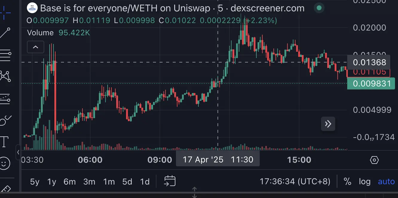 4 月 17 日凌晨 3:12,Base 官推在 Zora 平台发布 「Base is for everyone」代币,因为有官方背书,再加上Base 协议负责人jesse的转发,不少人误认为Base 官方发布了 Memecoin,甚至有社区成员将其误判为Base 发币。