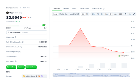 前脚特朗普刚在首届白宫加密峰会上畅聊稳定币的未来,后脚家族企业就开始了行动。3月25日,WLFI宣布推出名为USD1的稳定币,该稳定币与美元挂钩,并由美国政府短期国债、美元存款和其他现金等价物100%支持。USD1 将在ETH 和 BSC 区块链上铸造,并计划在未来扩展到其他协议,USD1储备将由BitGo托管。截止到如今,据CoinGecko数据,USD1 成交额已超4491万美元。