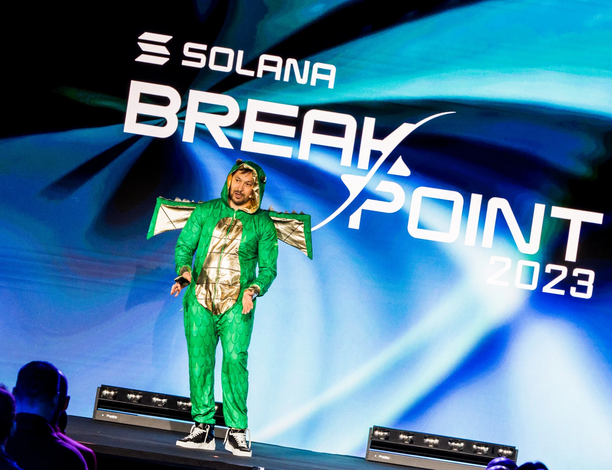 Solana 的 Breakpoint 大会也会时常成为 Meme 币的灵感来源,还记得前年 Toly 在大会上穿着绿色卡通龙形象服装,引爆之后一波对现象级 Meme SillyDragon 的关注么?