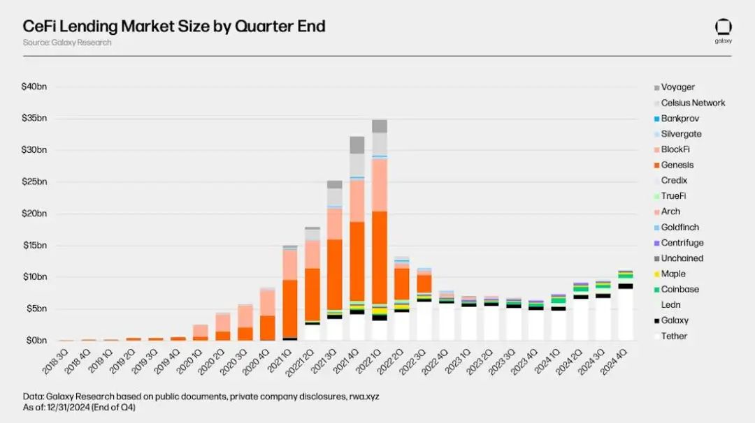 在市场高峰期,Galaxy Research估计,具有可获取数据的CeFi借贷平台的总贷款账面规模为348亿美元;而在市场低谷时,CeFi借贷市场的规模降至64亿美元(下降了82%)。截至2024年第四季度末,CeFi借贷市场的总规模为112亿美元,相较历史最高点下降了68%,但较熊市低谷时增长了73%。