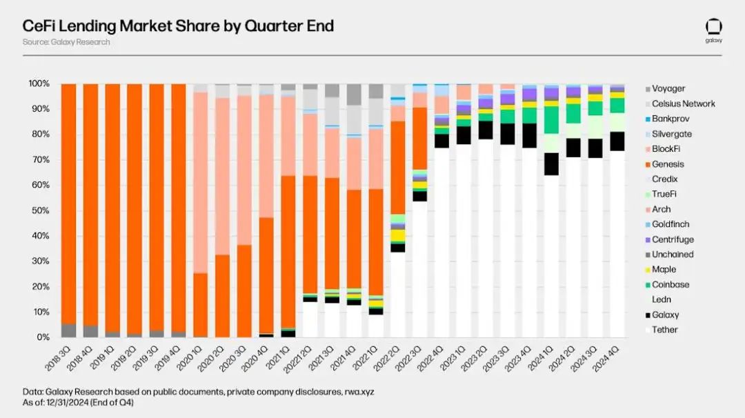 截至2024年第四季度,加密借贷市场总规模365亿美金,排名前3的中心化金融(CeFi)借贷机构包括Tether、Galaxy和Ledn,这三家公司在2024年第四季度末的贷款账面规模达到了99亿美元,占CeFi借贷市场的88.6%(Tether其中占比大概73%达82亿),而市场规模主要构成比例为:
