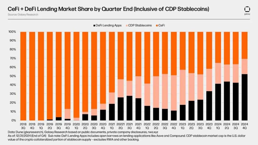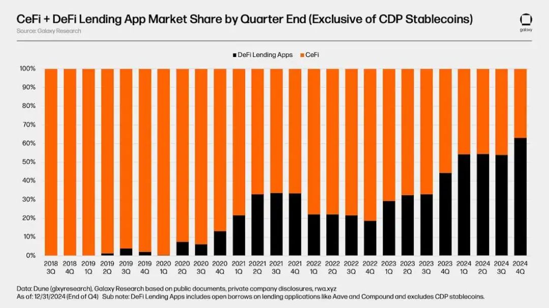 加密借贷市场的一个显著变化是DeFi借贷应用在熊市中表现出比CeFi平台更强的主导地位,并在市场复苏过程中继续扩张。2020-2021年牛市周期中,排除加密货币担保CDP稳定币的市场资本时,DeFi借贷应用占总加密货币借款的份额仅为34%;而截至2024年第四季度,DeFi借贷应用的市场份额已上升至63%,几乎是其原份额的两倍。