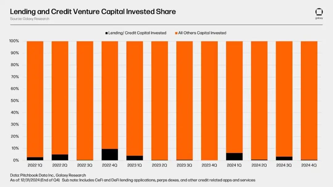 对于加密经济体,风险投资对借贷和信用应用的投资仅占总投资的一个小部分。从2022年第一季度到2024年第四季度,借贷和信用应用平均每季度仅占风险投资资本的2.8%。借贷和信用应用在2022年第四季度曾占据总季度资金的9.75%,为其最大份额;而在最近的2024年第四季度,所占份额仅为0.62%。