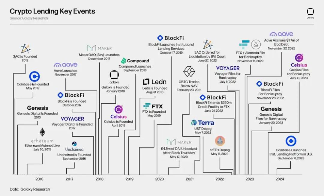 尽管链上和链下加密借贷直到2019年底/2020年初才开始广泛应用,但一些当前及历史上重要的参与者早在2012年就已经成立。值得注意的是,Genesis公司成立于2013年,其贷款账面规模一度高达146亿美元。像Aave、Sky(前身为MakerDAO)和Compound Finance等链上借贷和CDP稳定币巨头,分别在2017年到2018年间在以太坊平台上推出。这些链上借贷/借款解决方案的出现,得益于以太坊及其智能合约的问世,而以太坊智能合约在2015年7月正式上线。
