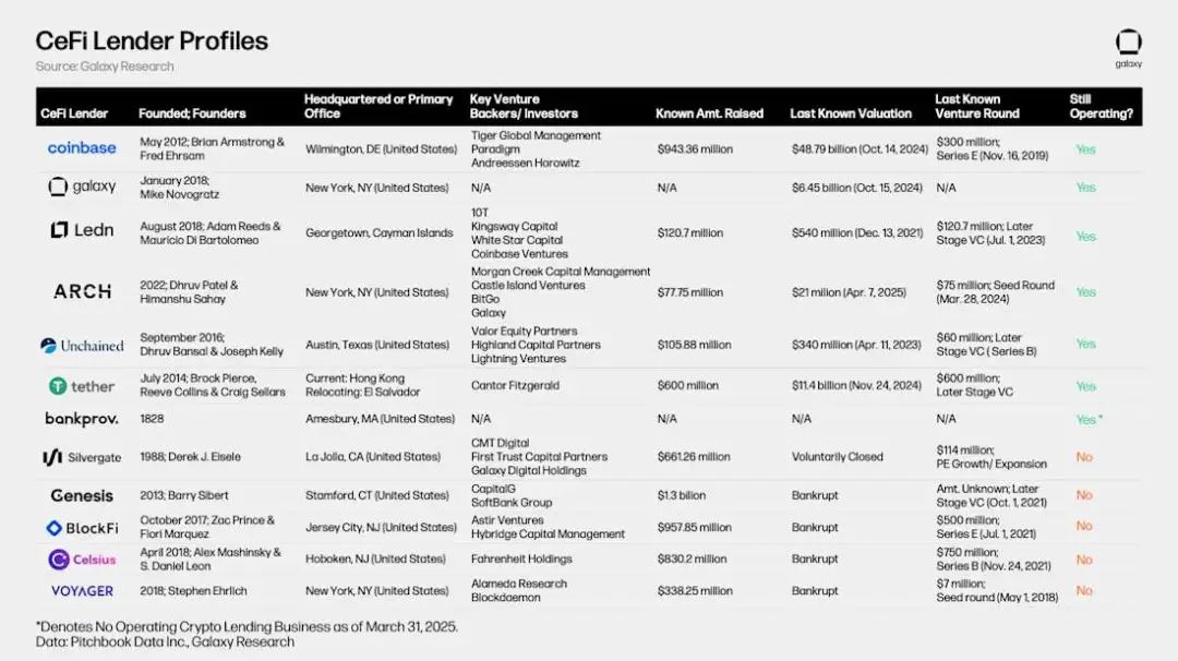 下表对比了历史上一些最大的CeFi加密借贷机构。部分列出的公司向投资者提供多项服务,例如Coinbase,虽然其主要运营为加密货币交易所,但通过场外交易(OTC)加密货币贷款和保证金融资向投资者提供信贷服务。