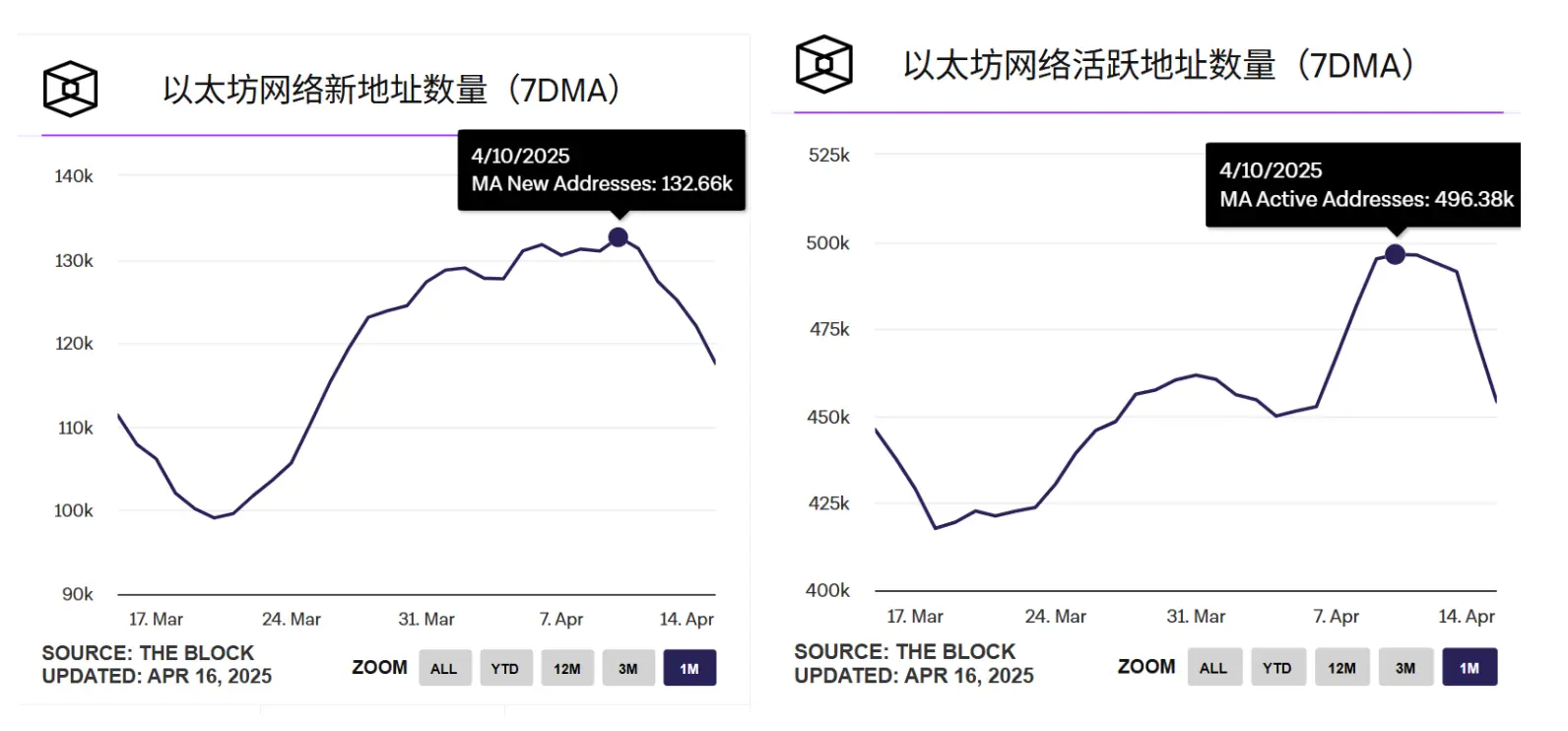 据 The Block 数据显示,自 4 月 10 日起,以太坊网络的新地址数量与活跃地址数量双双骤降,同时,以太坊的平均交易费用也从 0.86 美元下滑至 0.63 美元,网络活跃度急剧收缩。