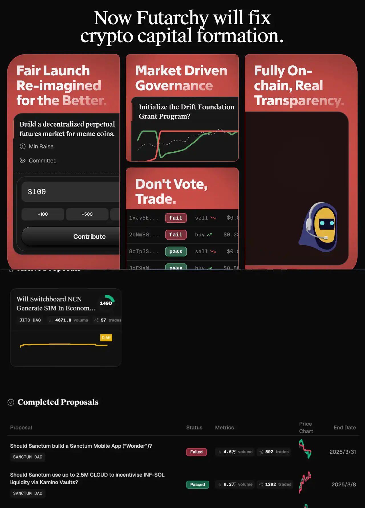 而他们选择的募资平台 MetaDAO 的创始人 Proph 3 t 正是是这个概念的推崇者,他认为「DAO 的目标是做出更好的决策,市场经验比专家更胜一筹。」而在 MetaDAO 中包括 Jito DAO、Sancutm、Ore、Drift 等项目提案都会使用交易期货的模式出现在 MetaDao 的提案库中。