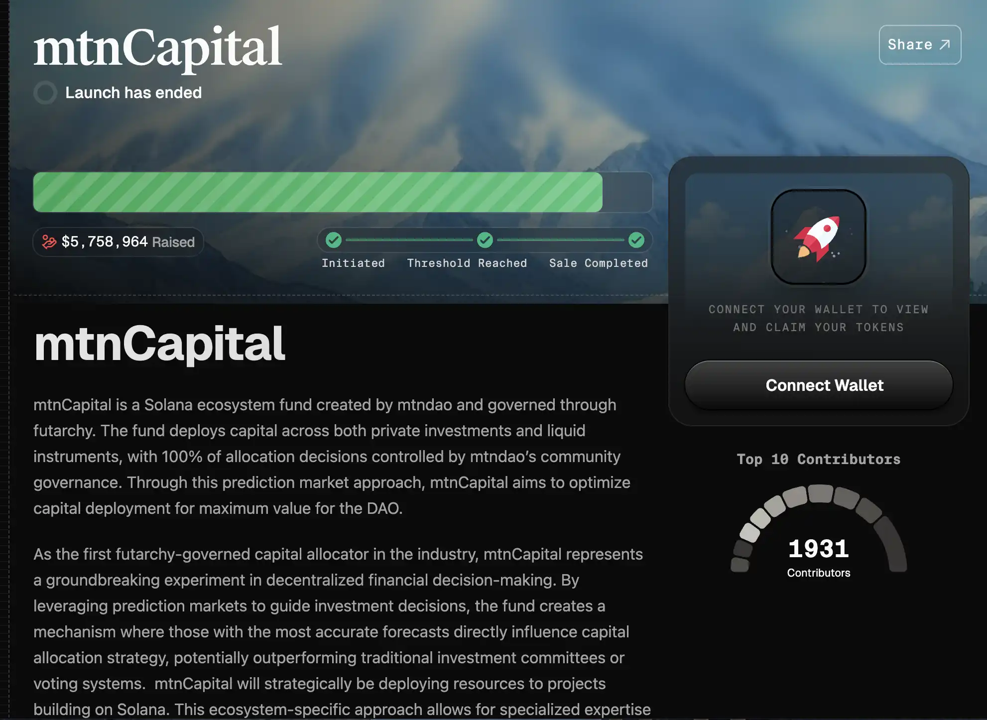 而在 DARK 发行后的 4 月 9 日,由 Edgar Pavlovsky 和 Barrett 联合创立的开发者之家 DAO 组织 MtnDAO 也结束了自己在 MetaDAO 上为 MtnCapital 的募资。MtnDao 在早期便深度参与到 Solana 的开发者社区的建设中,而 Mtn Captital 是他们想要开创一种新的投资管理模式,即以 futarchy「市场预测」来指导治理决策,可以将$MTN 比做期货,由期货管理的基金。最终结果是在 7 天的时间内共 1931 个贡献者为其募资了 575 万美元。